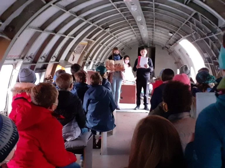 Drei Klassen unserer Schule machten sich am 19.11. 2021 fröhlich auf den Weg zum Alliiertenmuseum. Seit Tagen hatten sich Schüler*innen auf ihren Auftritt im Rosinenbomber vorbereitet und fleißig ihre Texte geübt, denn jedes Jahr lesen die Siebtklässler unserer Schule Grundschülern aus Berlin die Geschichte um unseren Namenspatron Gail S. Halvorsen vor.