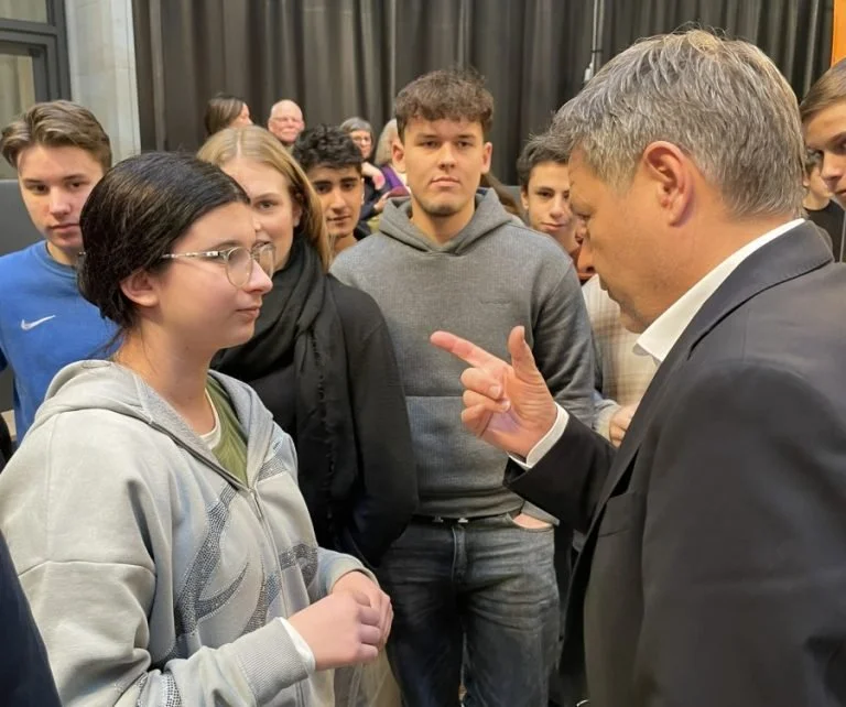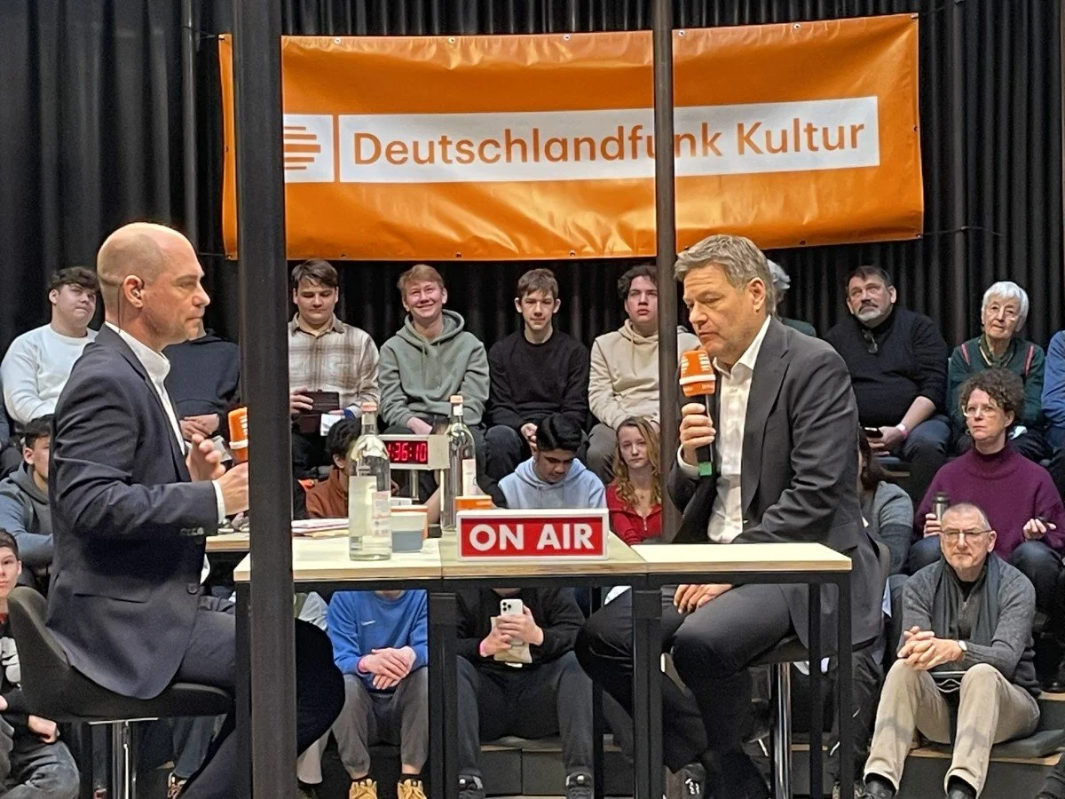 Am 9. Januar 2025 war die 11. Klasse im „Studio 9“, dem Live-Studio des Deutschlandradios im Humboldt Forum Berlin. Der Kanzlerkandidat der Grünen, Robert Habeck, stellte sich im Live-Interview den Fragen des Moderators Korbinian Frenzel. Zahlreiche Fragen aus dem Publikum, so auch von unseren Schülerinnen und Schülern, wurden geduldig von Robert Habeck in der knapp 75minütigen Live-Sendung beantwortet. Im Anschluss an die Übertragung hatten wir auch noch Gelegenheit, direkt mit Herrn Habeck zu diskutieren.